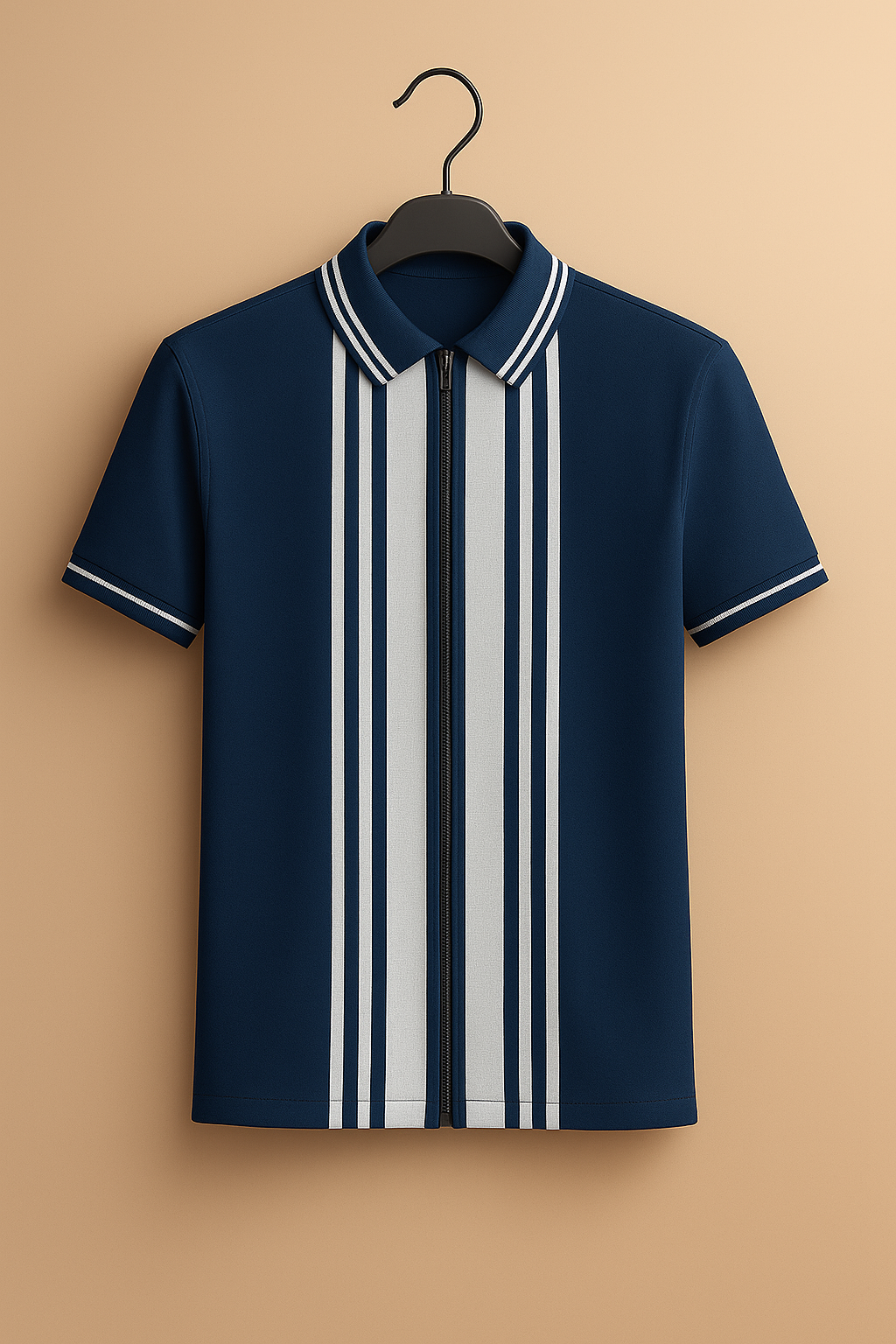 Refined. Relaxed. Relentlessly stylish. Elevate your essentials with the Black Zipper Striped Polo Shirt a modern twist on classic prep. Crafted from breathable cotton-blend fabric, this shirt features a sleek half-zip closure and bold vertical stripes that elongate the silhouette. The camel hue adds understated luxury, while the tailored fit ensures sharp lines from shoulder to hem.